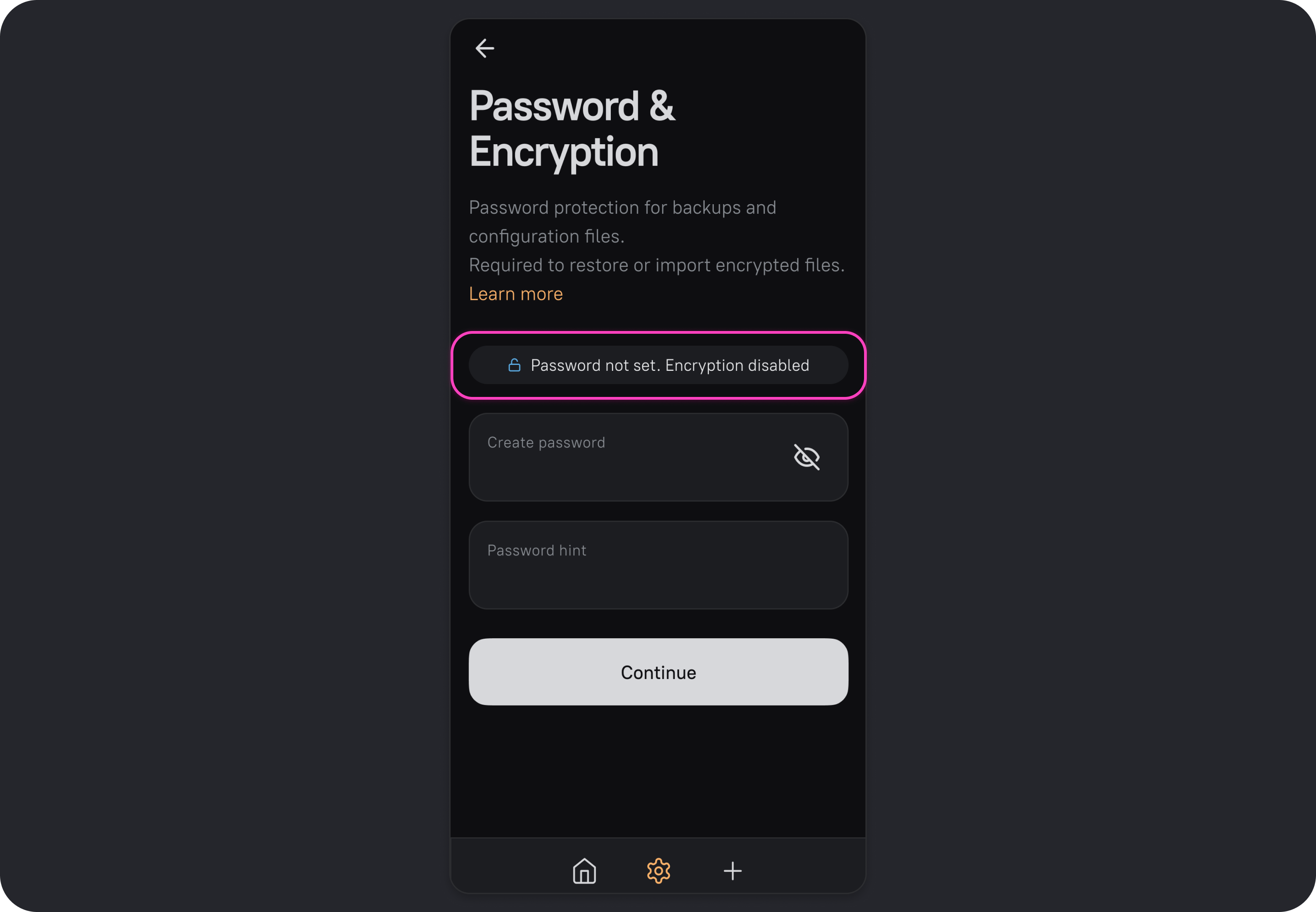 - Set a password. Optionally, add a hint to help you remember it, and tap Continue.