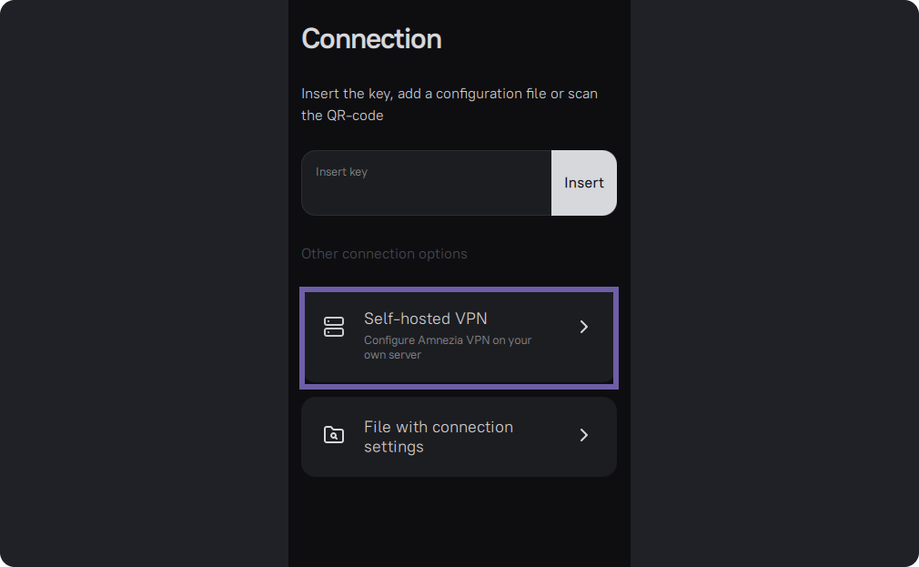 If you purchased a VPS for Amnezia from Inferno Solution, you may receive a key in text format like VPN:///ue34nf\feh..... instead of IP, login, and password. In this case, refer to the guide Connecting via Text Key.