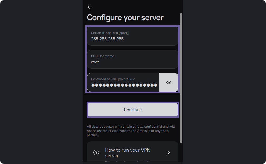On the first screen, the application will ask for your connection details; these are the credentials for your VPS server. If you don’t have a VPS server, refer to the guide How to set up your VPN using Amnezia, which contains examples and instructions for purchasing hosting and selecting the necessary settings. After purchasing a VPS, hosting providers will send you the IP, username or ID, and server password via email. These details will look something like this: