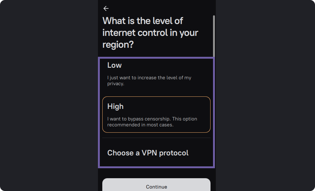 If all non-state-controlled sites and almost all commercial and non-commercial VPNs are blocked in your region, we recommend selecting the High level of control for your first connection and avoiding other protocols. Otherwise, the IP address of your VPS may be detected and blocked by analysis systems, and you won’t be able to use it in the future.