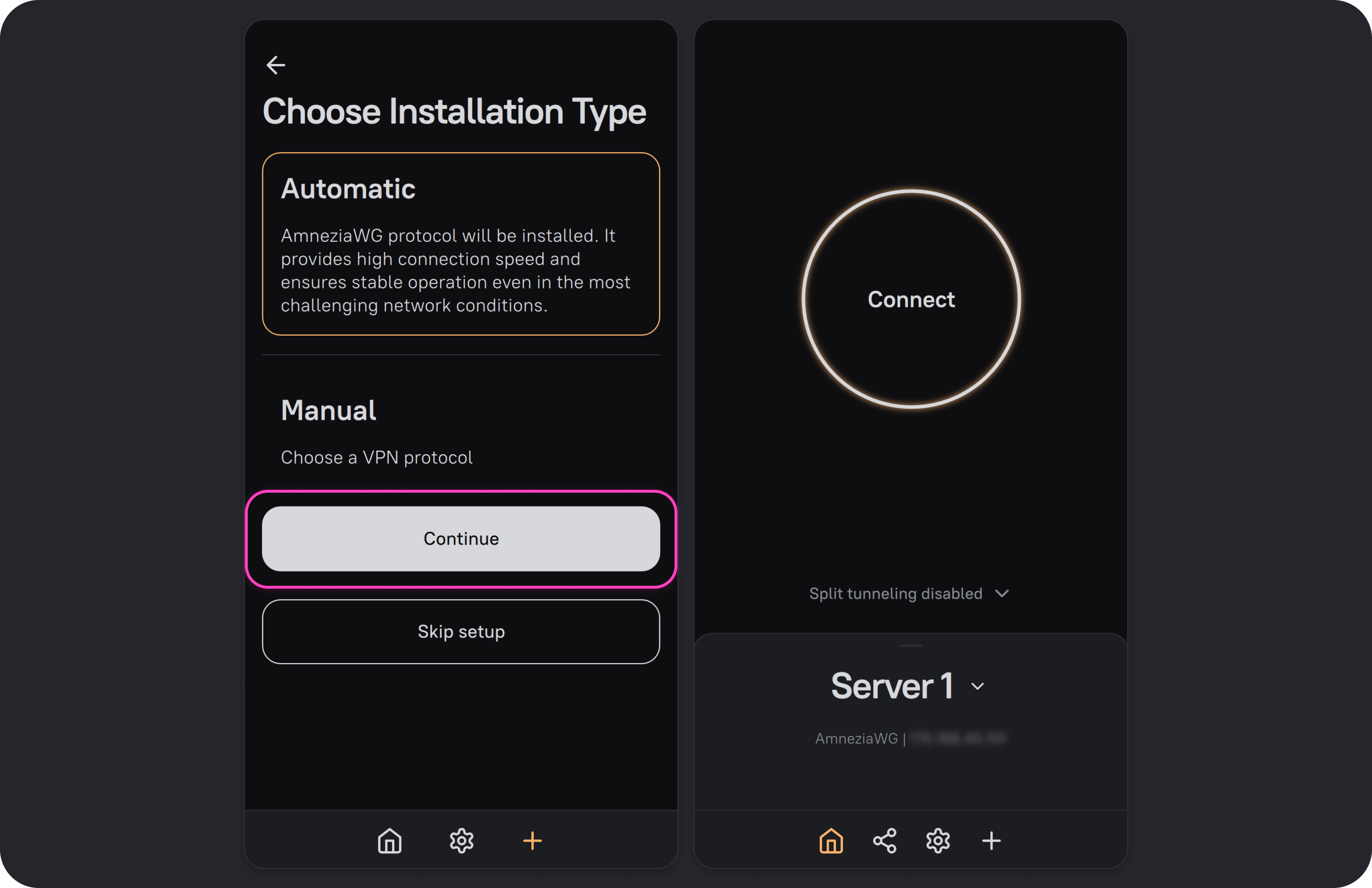 If you click Skip setup, AmneziaVPN creates an empty connection without running any commands on the server.