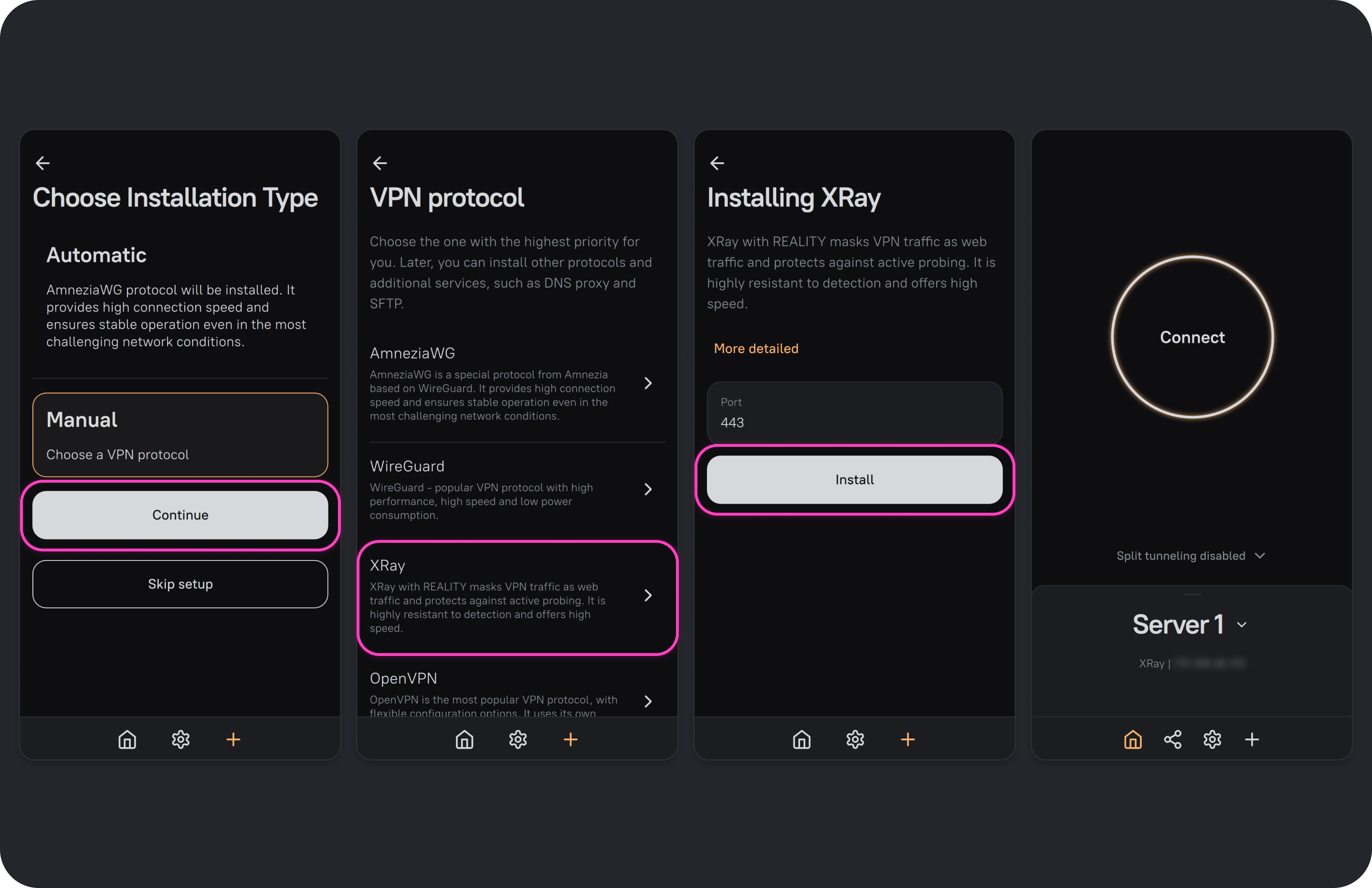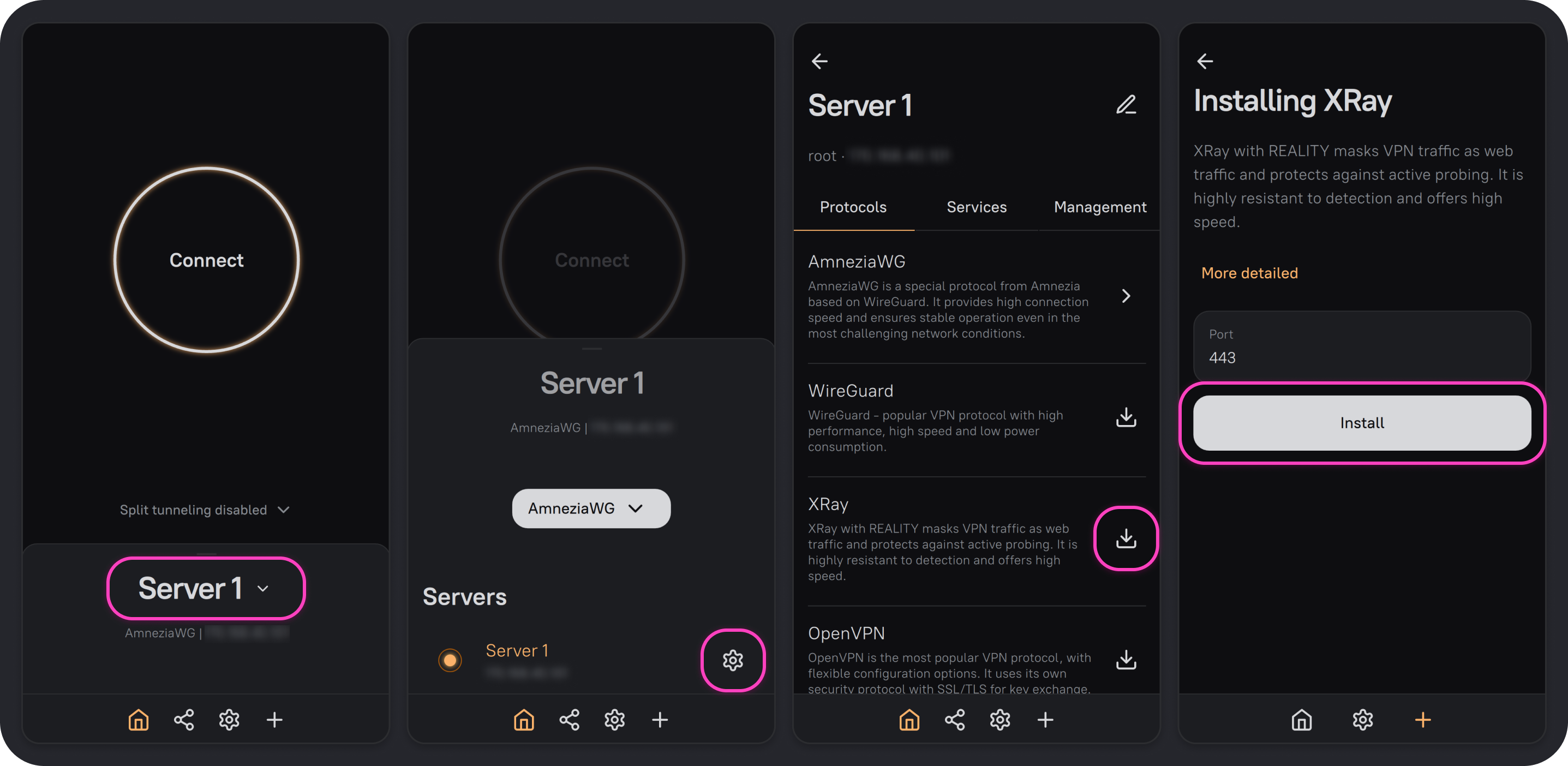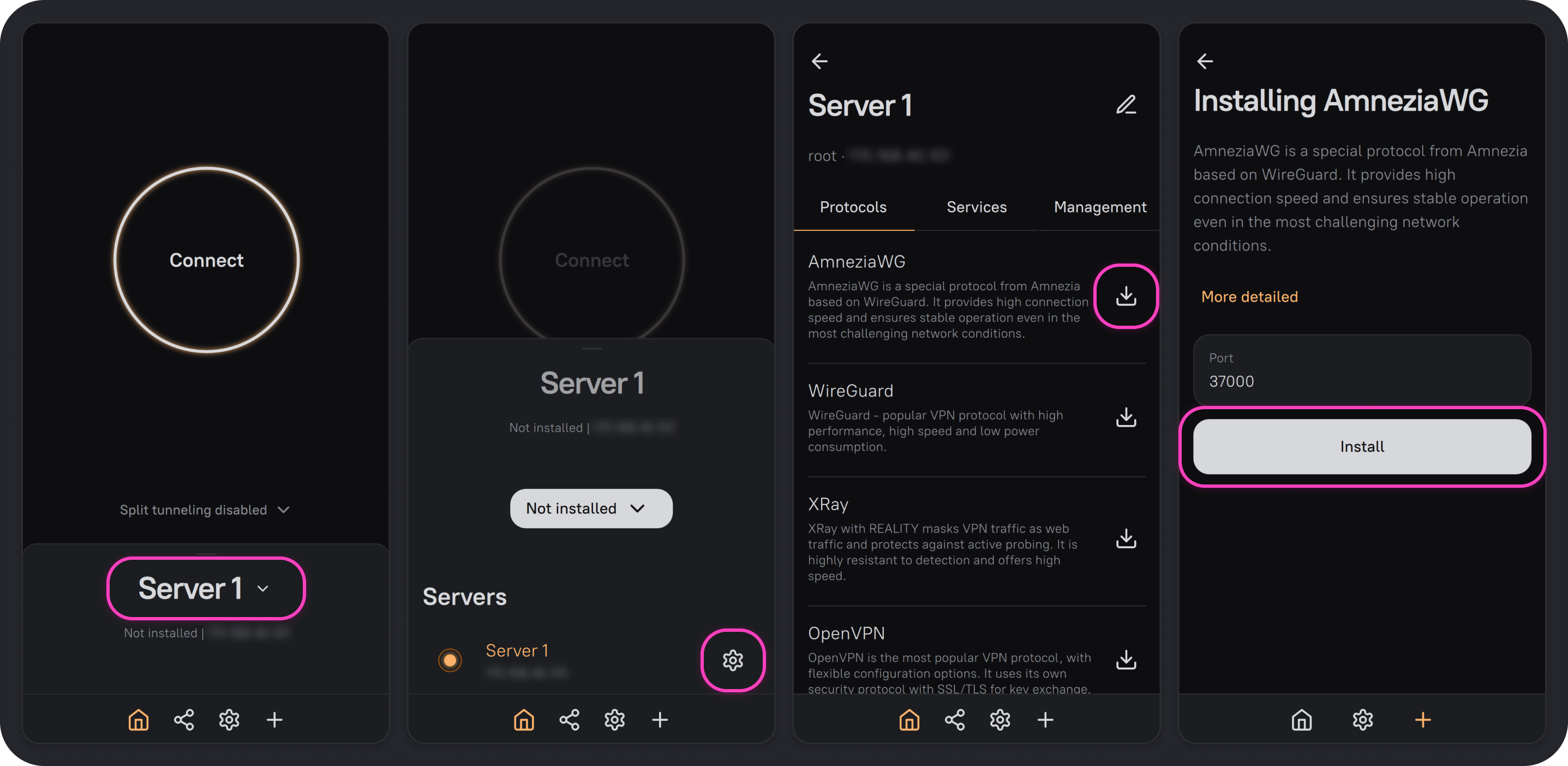 If you installed the AmneziaWG protocol, adjust its settings right away to better bypass restrictions: Using AmneziaWG 1.5 Protocol on Self-hosted Servers.