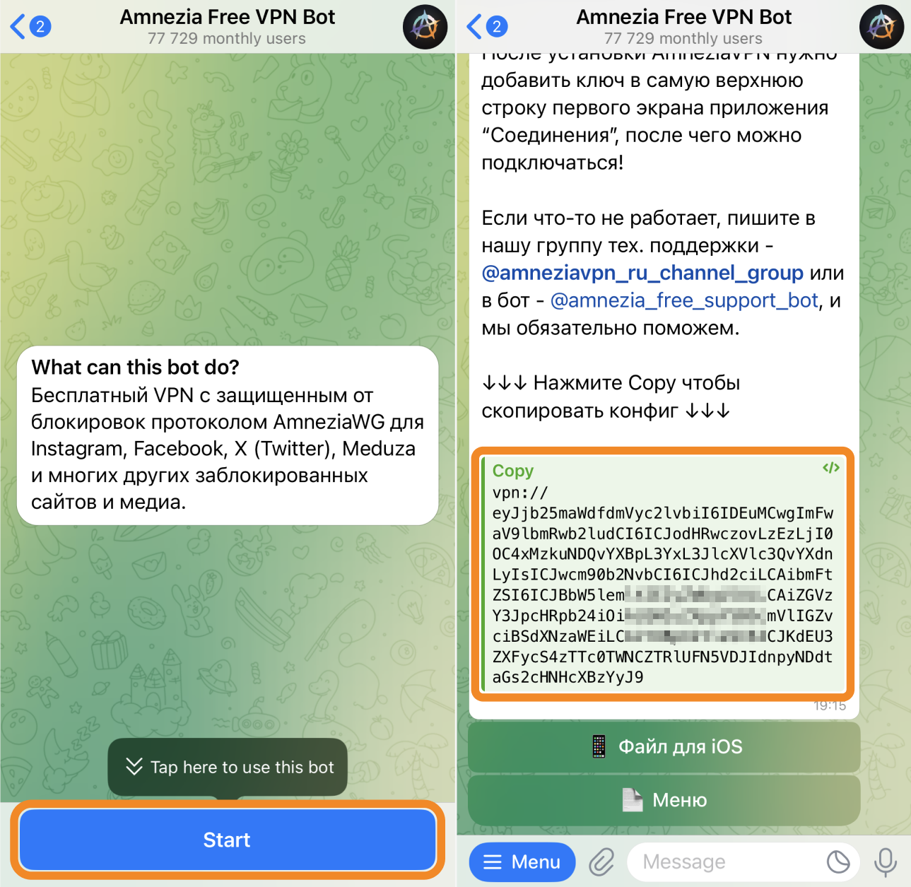 - Нажмите кнопку Start в чате с ботом, в ответ вы получите сообщение с ключом vpn:// для подключения.