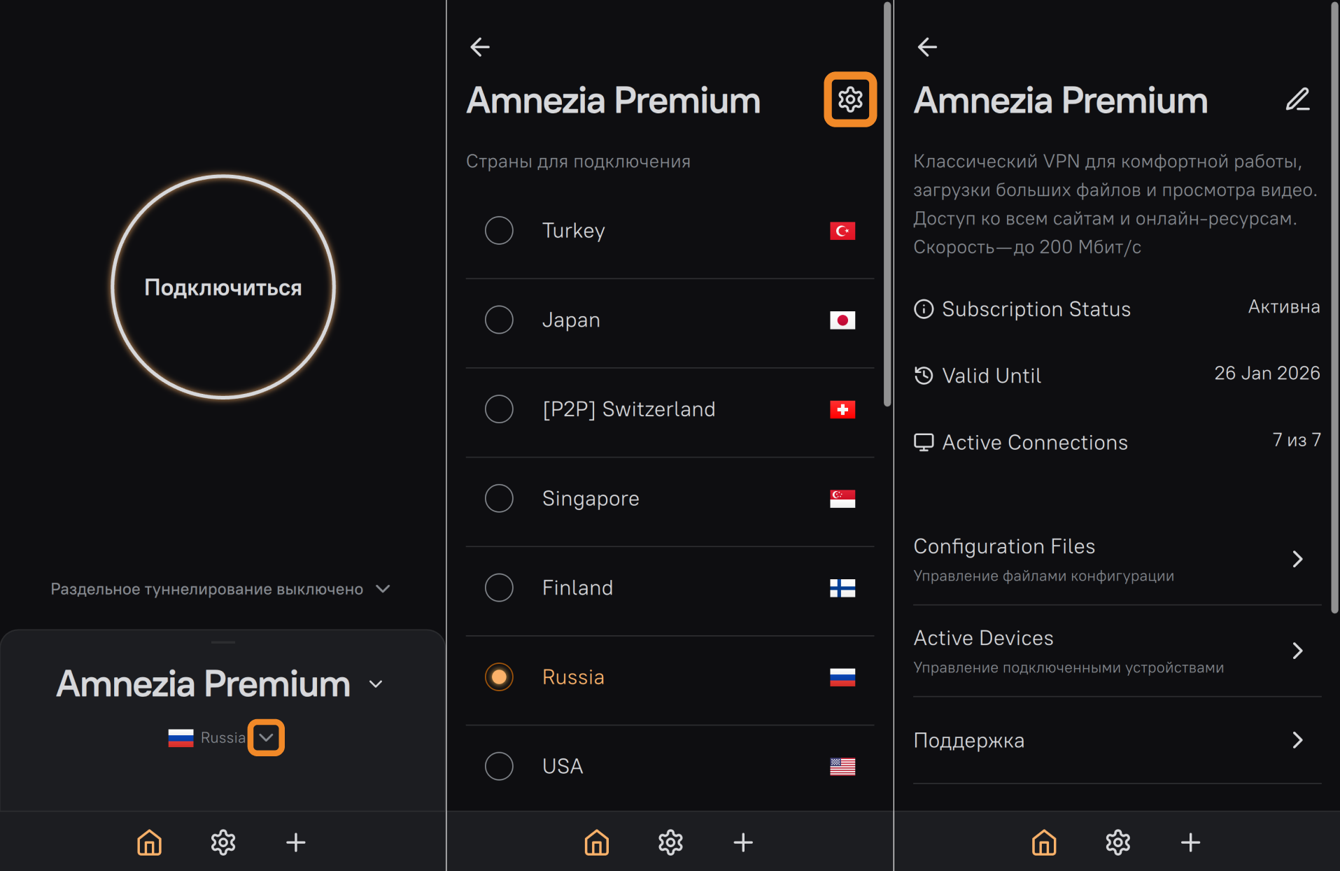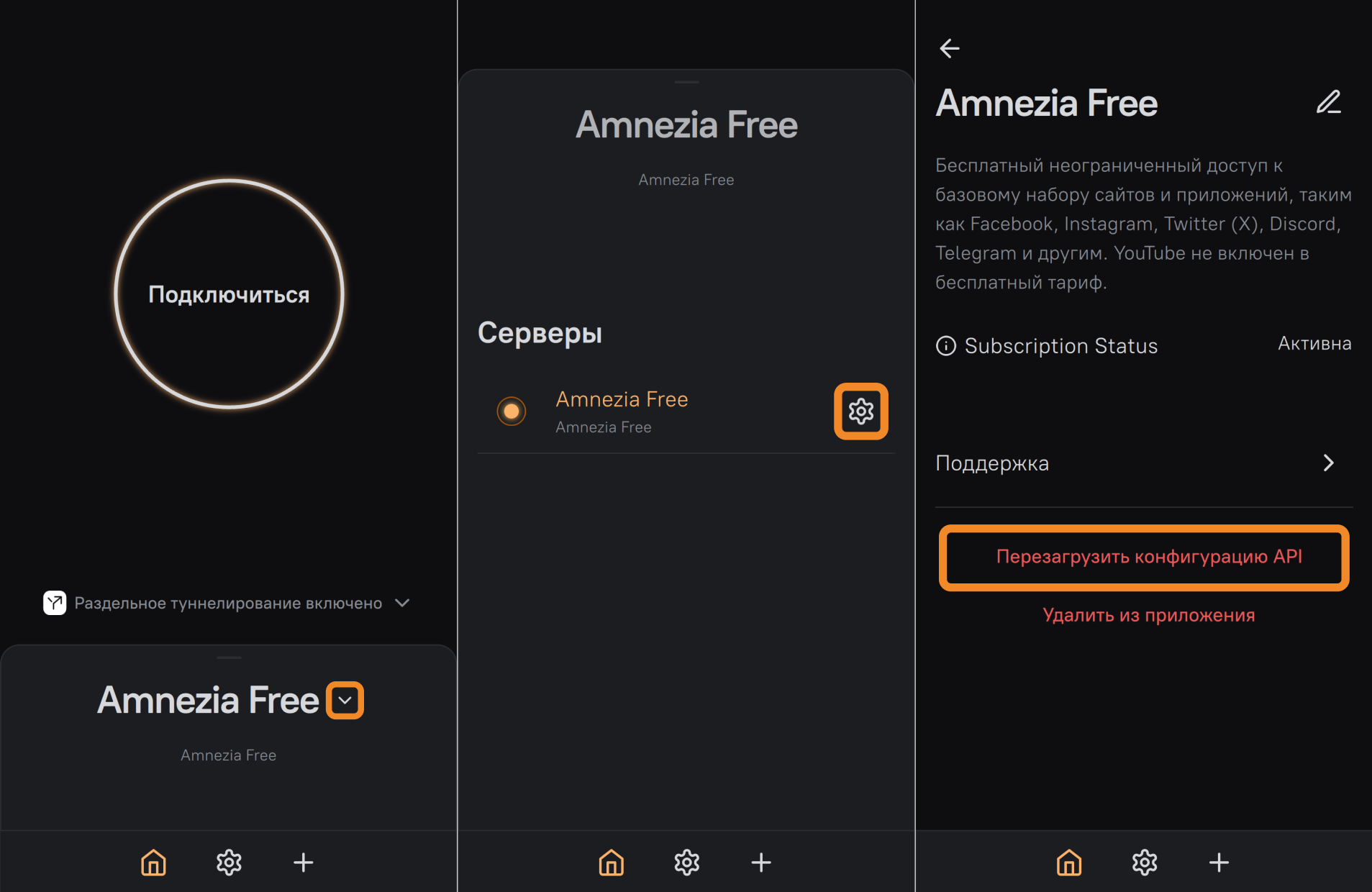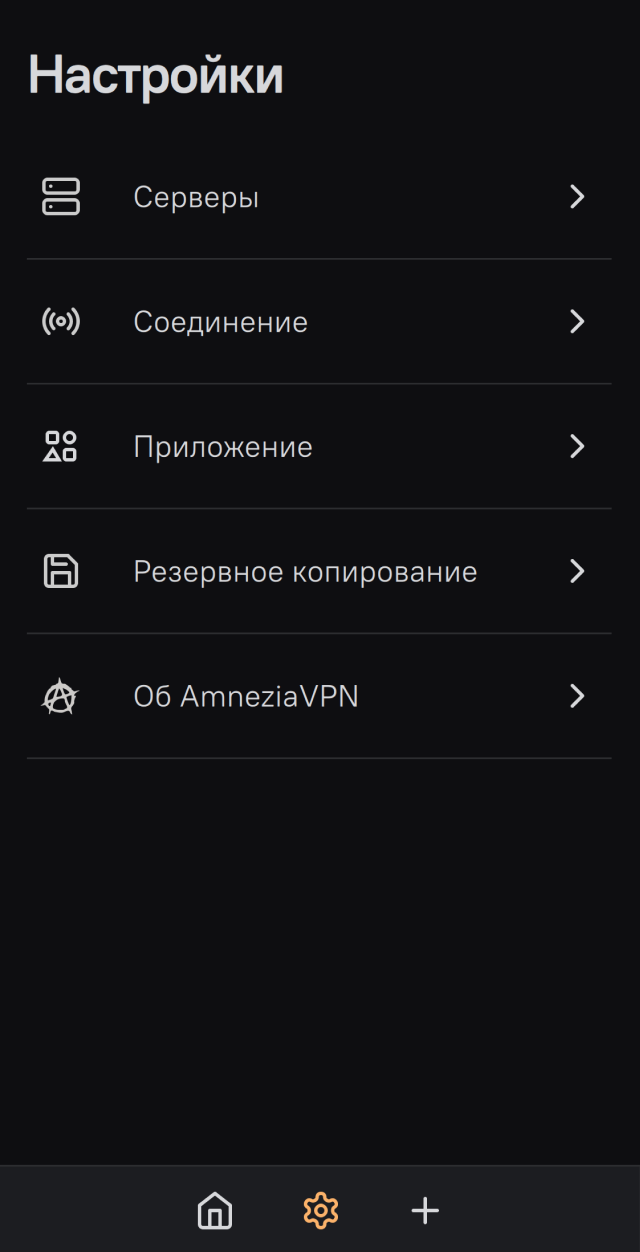 - Серверы: используйте для управления добавленными подключениями, например, Amnezia или Amnezia VPN.