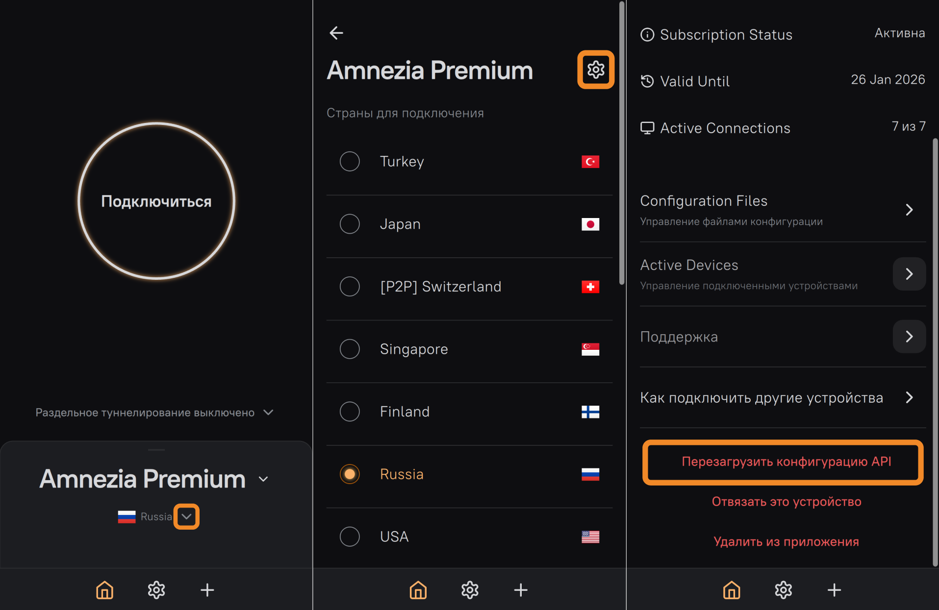 В приложении AmneziaVPN доступны те же функции управлен ия вашей подпиской, что и в личном кабинете: