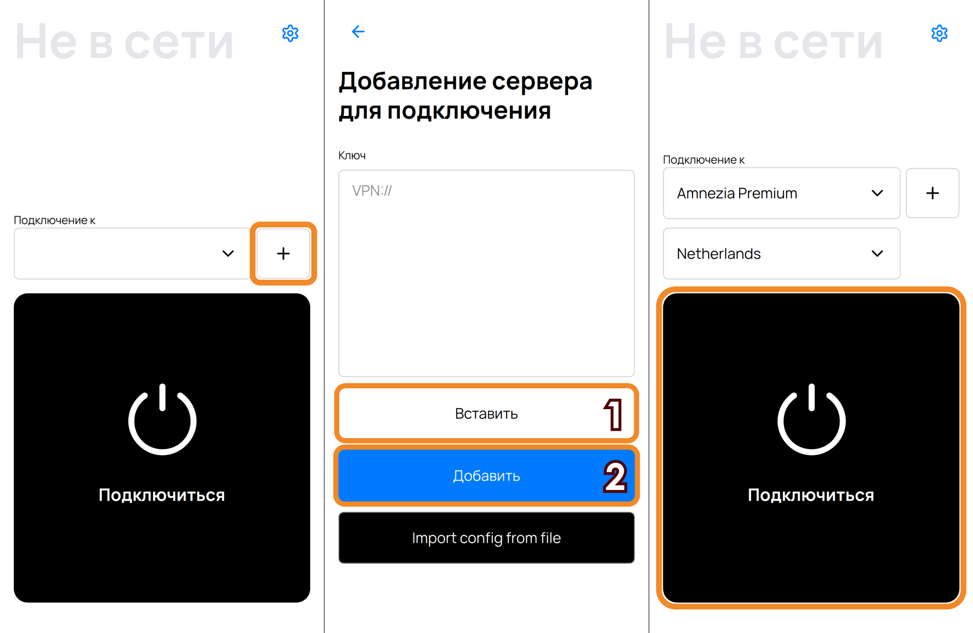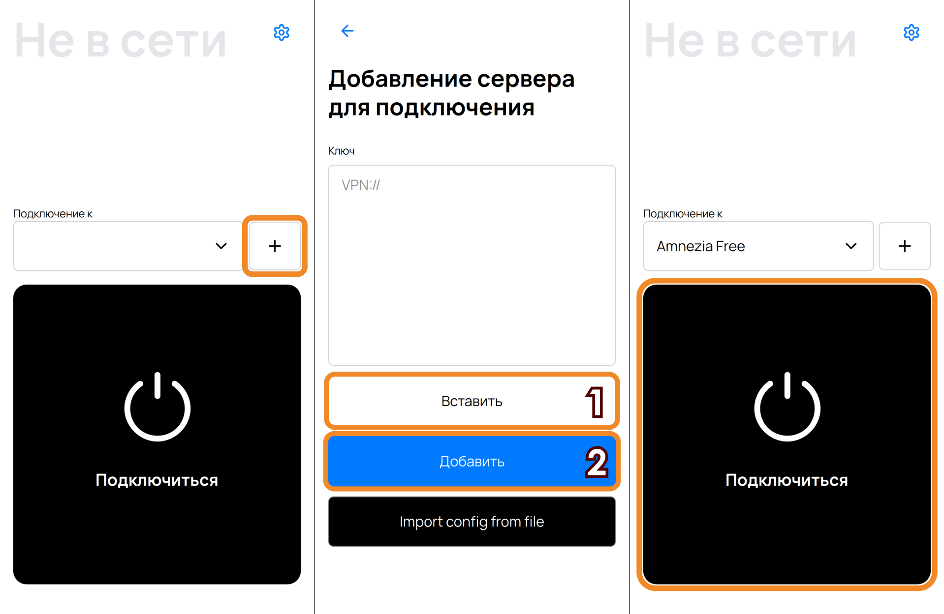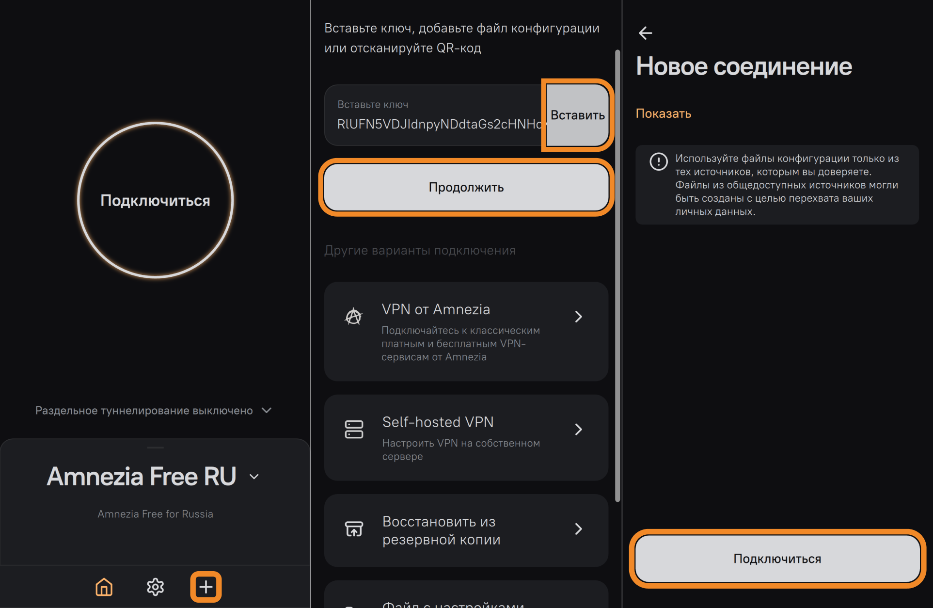 Подключение через ключ в приложениях AmneziaVPN и DefaultVPN