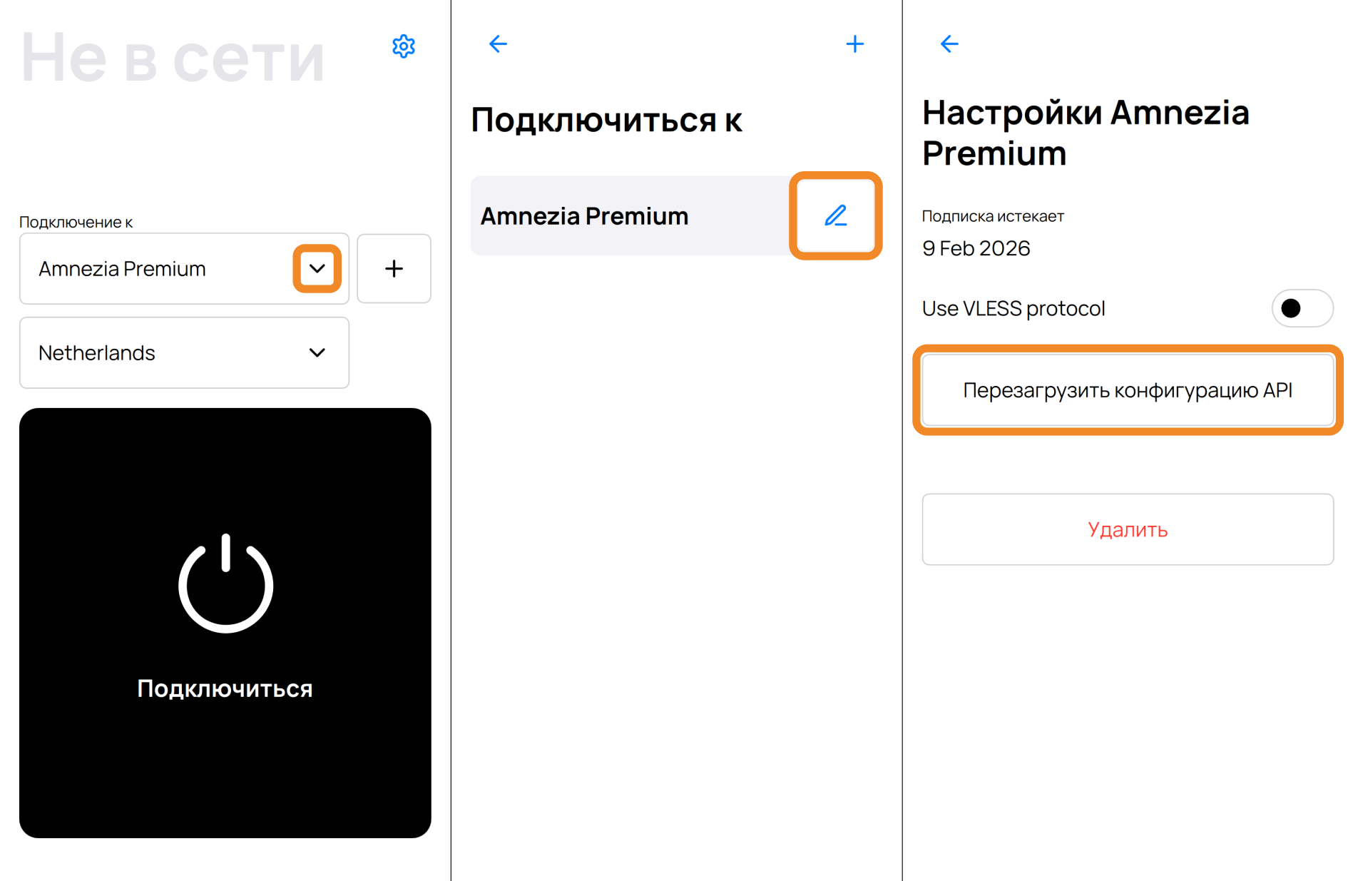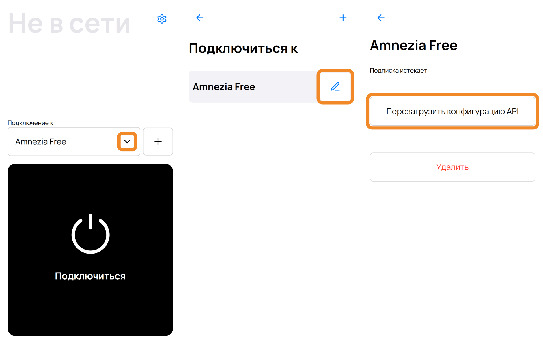 - На следующем экране нажмите на иконку 📝 (карандаш) справа от Amnezia VPN.