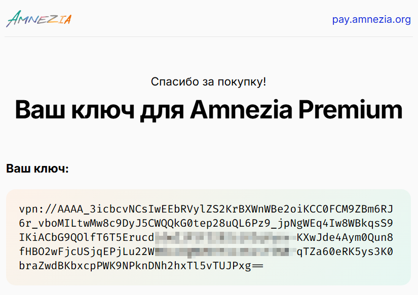 Если у вас ещё нет подписки Amnezia VPN, подробную информацию о ней вы можете найти на нашем сайте: