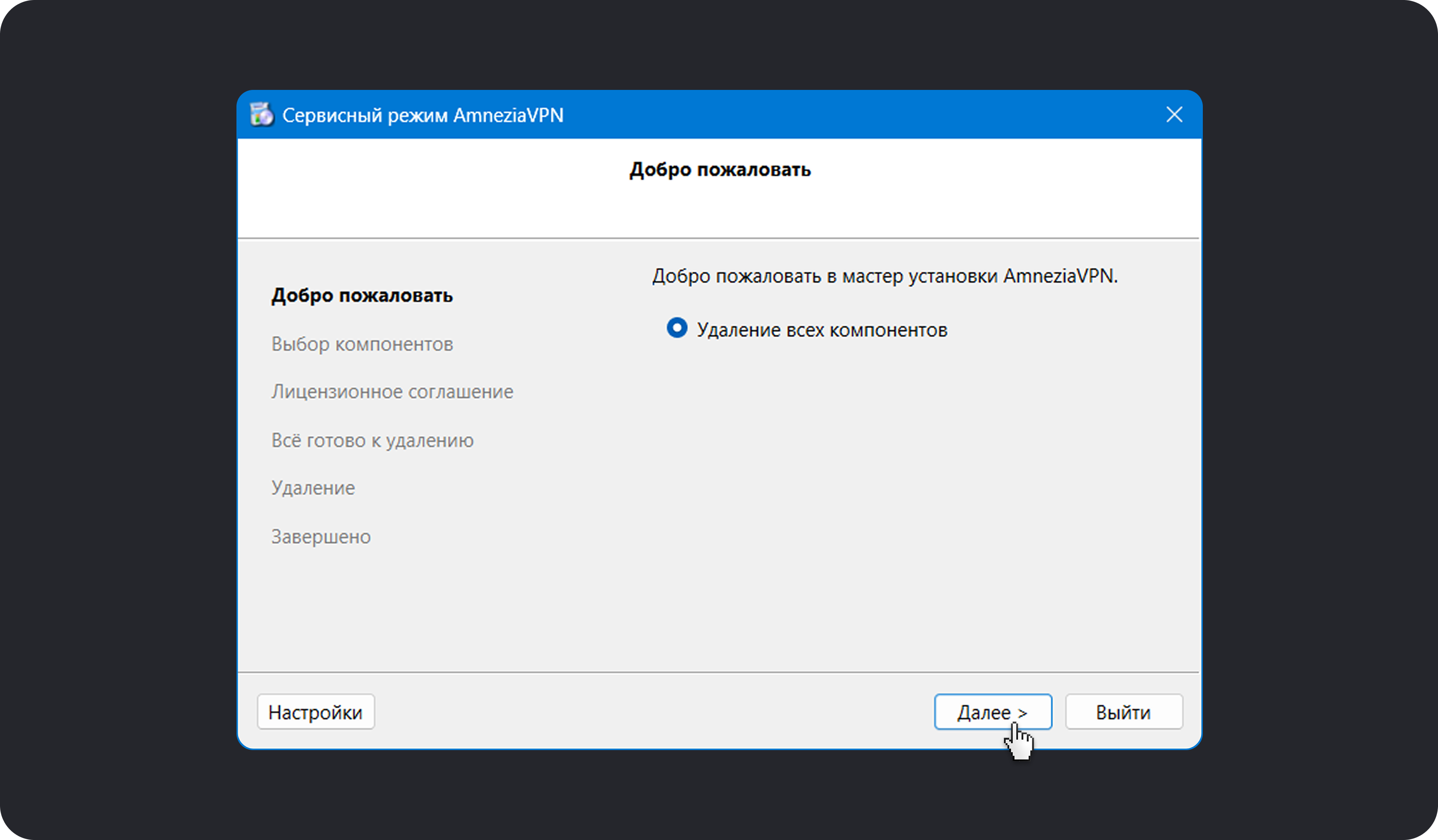 .exe, во всплывающем окне нажмите кнопку OK, чтобы перейти к процессу удаления установленной версии приложения AmneziaVPN.